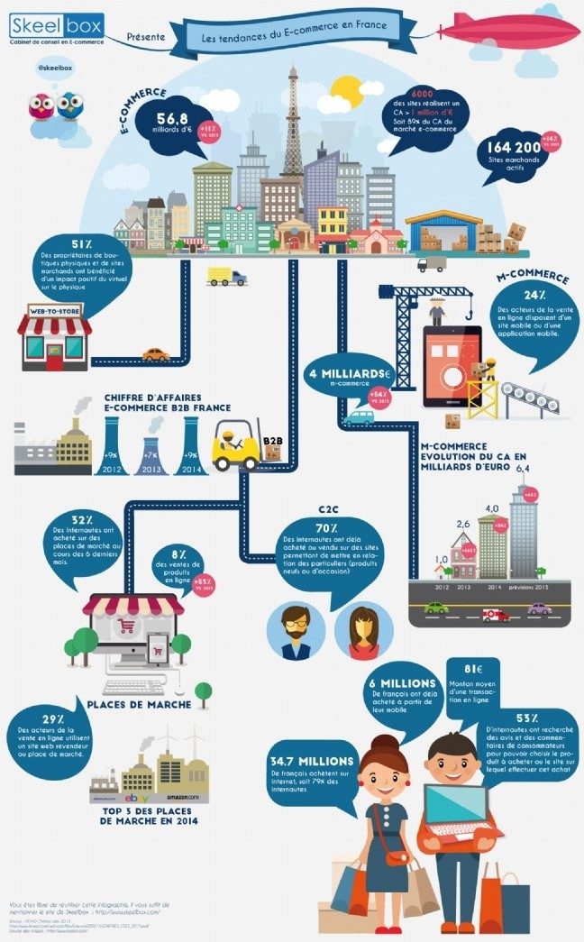 - Le e-commerce représente 56.8 milliards d’euros. 34.7 millions de français achètent sur internet soit 79% des internautes. 6 millions d’entre eux ont déjà acheté à partir de leur mobile.