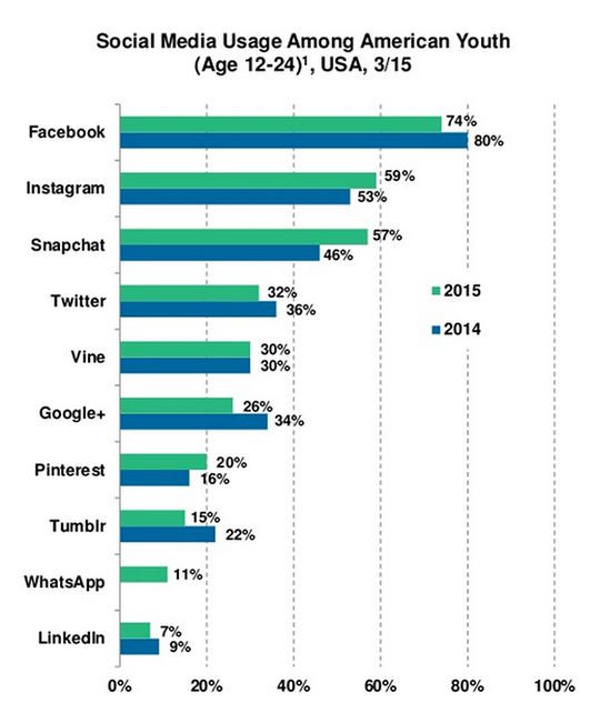 Cette étude montre l’évolution de l’utilisation des réseaux sociaux chez les jeunes américains, mais elle peut être transposée à d’autres pays puisque les réseaux sociaux subissent un phénomène de mode. On peut voir que Facebook subit un léger recul de son utilisation auprès des jeunes américains qui lui préfèrent Instagram ou Snapchat. Les jeunes préfèrent donc communiquer grâce à des photos ou à des courtes vidéos plutôt que par messages ou publications écrites. De nombreux réseaux sociaux subissent un net recul dans leurs utilisations comme Google +, Tumblr ou bien LinkedIn qui sont des réseaux sociaux qui s’adressent plus souvent à une tranche d’âge plus élevée.