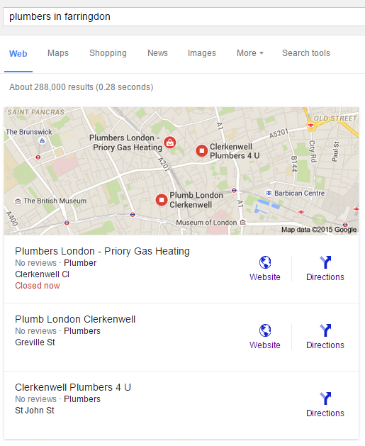 Depuis Août 2015, Google a modifié la façon dont il affichait les résultats de recherche locales : la liste habituelle des 7 adresses n’existe plus. Les recherches locales apparaissent maintenant comme suit :