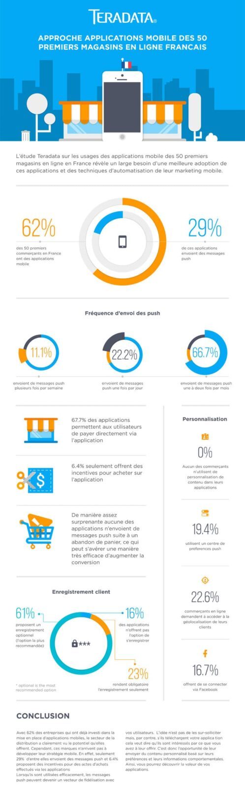 La dernière étude de Teradata nous indique que l’utilisation du smartphone afin de réaliser des achats est largement répandu en France mais constat alarmant, dans le Top 50 des e-commerçants français, aucun n’utilise la personnalisation alors qu’ils sont tout de même 62% à avoir développé une application mobile dédiée.