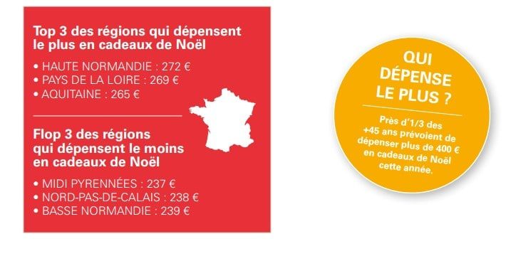 Les régions qui dépensent le plus en cadeaux de Noël sont : Haute Normandie, Pays de la Loire et Aquitaine. Au contraire, celles qui dépensent le moins sont : Midi Pyrennées, Nord-pas-de-Calais et Basse Normandie.