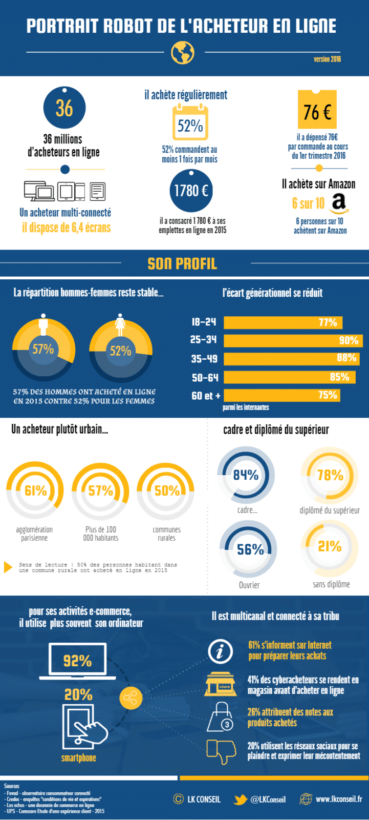 Vous êtes-vous déjà demandé quel était le profil type d’un cyberacheteur ? Quelles sont les caractéristiques des acheteurs qui viennent faire leur shopping sur votre e-boutique ? Découvrez en une infographie réalisée par LK Conseil, ce qu’il faut savoir sur les cyberacheteurs en 2016.
