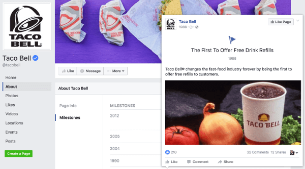 Les dates clés sont un type particulier de message Facebook qui met en lumière les réalisations importantes et les événements passés. C’est une excellente façon de partager l’histoire de votre marque et de donner un contexte historique pour votre entreprise. Par exemple, saviez-vous Taco Bell a été le premier restaurant fast-food à offrir des recharges de boissons gratuites ? La marque a pu l’ajouter dans son « histoire » en tant que date clé sur facebook.
