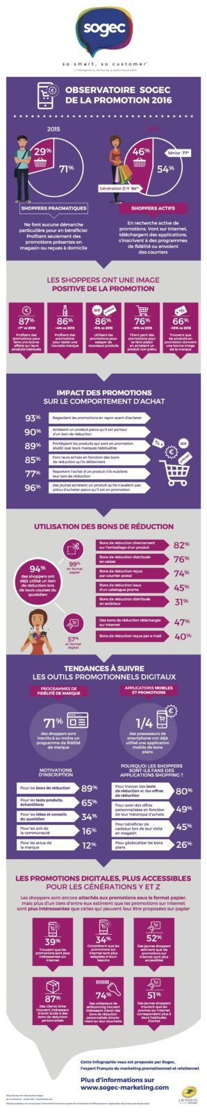Les jeunes shoppers de la génération Y et Z sont particulièrement attachés aux promotions digitales. Bien que les autres consommateurs soient encore intéressés par les promotions « papier », pensez à faire évoluer votre offre. Les générations Y et Z sont les shoppers d’aujourd’hui mais encore plus les shoppers de demain !