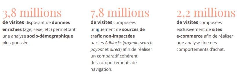 Fabernovel, a réalisé une étude de mai à août 2016 sur 9,8 millions de sessions desktop. L’objectif était d’analyser les tendances liées aux Adblocks (téléchargez le livre blanc avec tous les résultats en détails). Voilà les caractéristiques de l’échantillon :