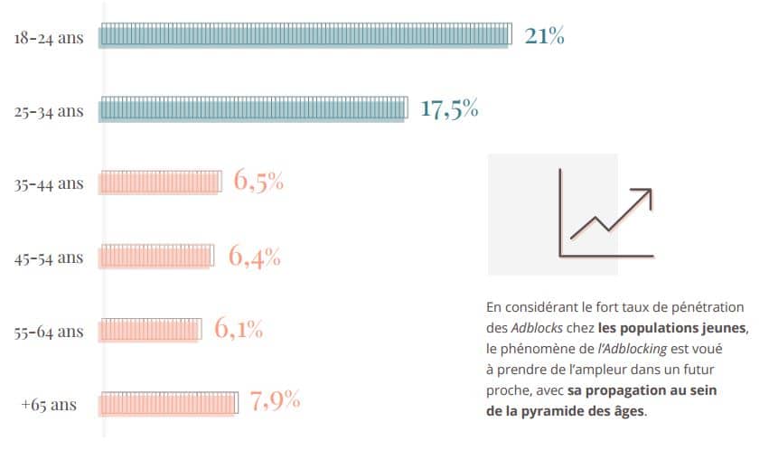 58% des utilisateurs d’adblocks sont des hommes et 42% sont des femmes. Ce sont les 18-24 ans qui utilisent le plus les adblocks (21%). De façon générale, les internautes les plus jeunes sont plus enclins à utiliser des logiciels bloquant les publicités.