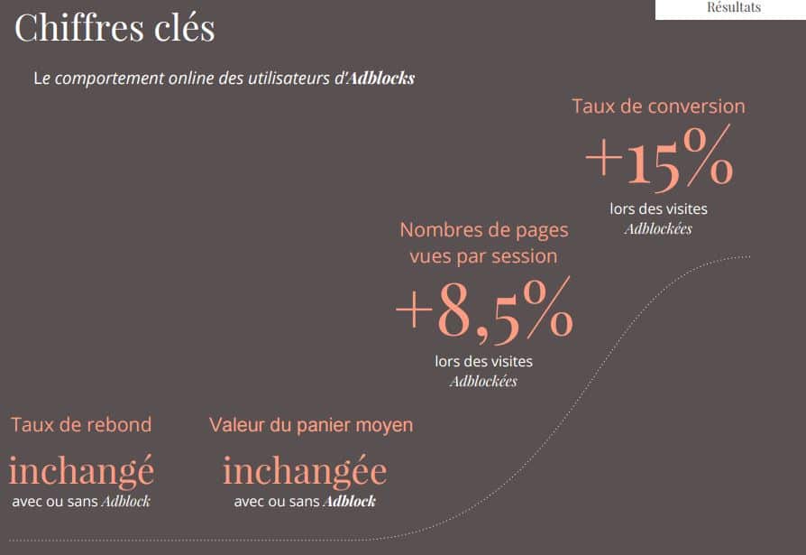 L’étude réalisée nous permet de comprendre l’impact des logiciels bloqueurs de publicité sur les KPIs web. Par exemple, le taux de rebond reste inchangé avec ou sans Adblock. De la même façon, la valeur du panier moyen se trouve inchangée pour les sessions avec ou sans adblock.