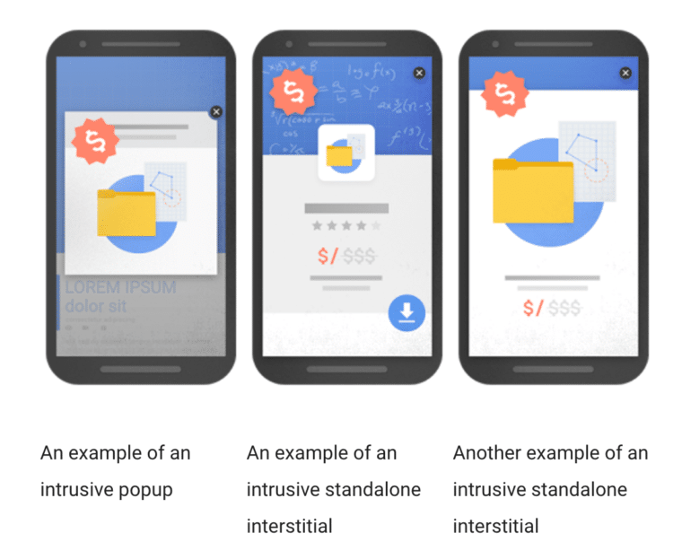 Google avait déjà annoncé en Août 2016 qu’il commencerait à dévaluer les pages Web qui, dans la recherche mobile, comportaient des interstitiels intrusifs. Cette pénalité a pris effet à partir du 10 Janvier 2017. Google recommande l’utilisation d’interstitiels sur les pages mobiles qui prennent une place « raisonnable » sur l’écran.