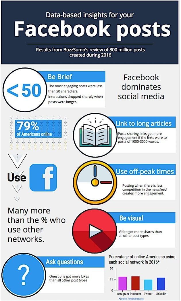 Nous vous proposons quelques indices publiés par BuzzSumo après l’examen de 800 millions de messages Facebook en 2016 :