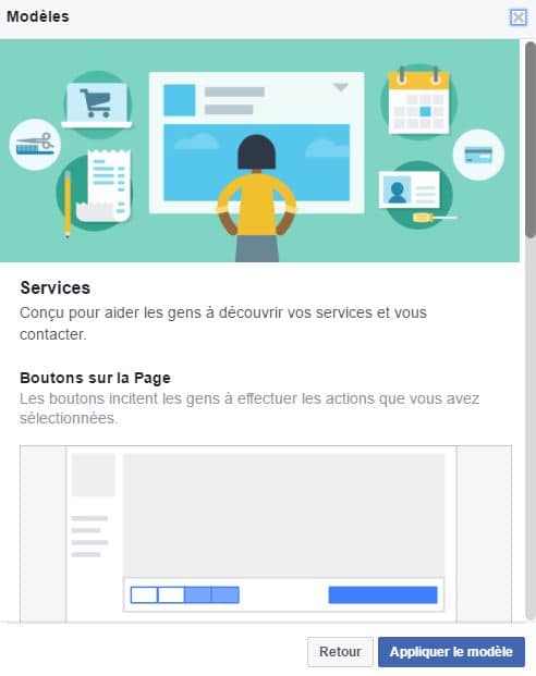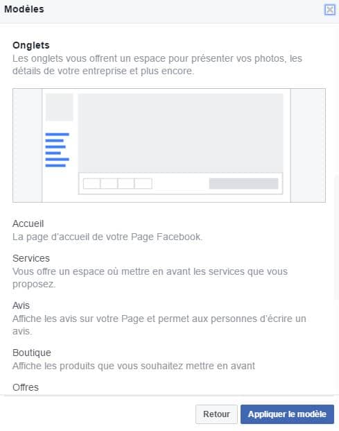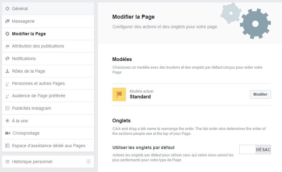 Facebook propose des modèles de page qui permettent de configurer certains éléments : onglets, actions,… Ces modèles sont différents en terme de construction. Afin de modifier votre page en fonction de ces modèles rendez-vous dans Paramètres > Modifier la Page.