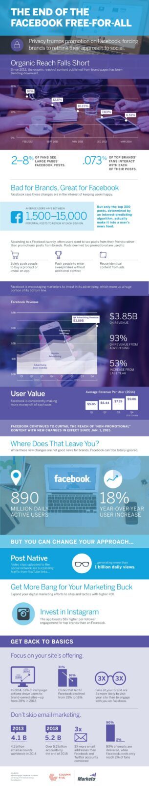 Depuis 2012, la portée organique du contenu sur Facebook est de plus en plus faible. En 2012, la portée était de 16%. Elle est passée à 6.51% en 2014. Les marques ont donc de plus en plus de difficultés à mettre en avant leur contenu aux yeux des consommateurs. Seulement 300 post peuvent être mis en avant aux yeux des utilisateurs de facebook (en fonction de leurs intérêts).