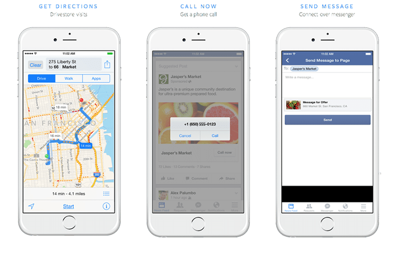 Puisque le mobile est de plus en plus utilisé au quotidien dans la recherche d’informations sur un produit, dans la recherche d’une adresse où celui-ci est vendu, et tout cela en situation de mobilité, Facebook propose un format d’annonce permettant de cibler les personnes qui se trouvent à proximité du magasin et qui recherche un produit similaire au vôtre. Dans cette publicité est inclus un appel à l’action du type « appeler », « s’y rendre », etc.