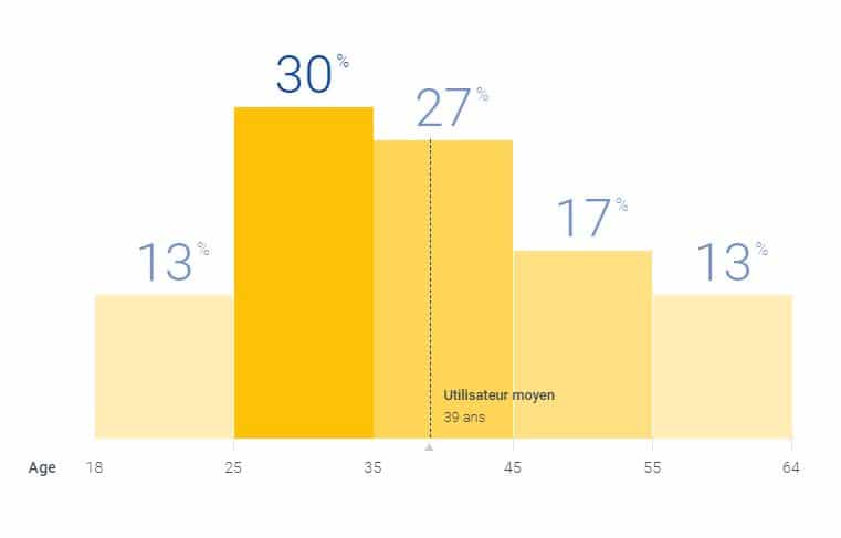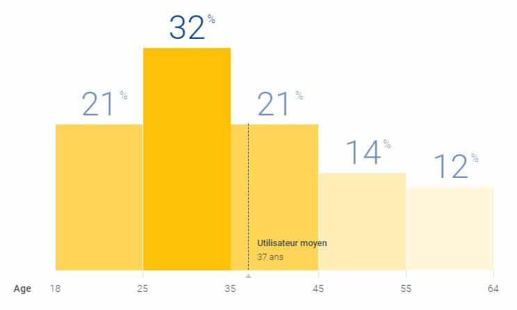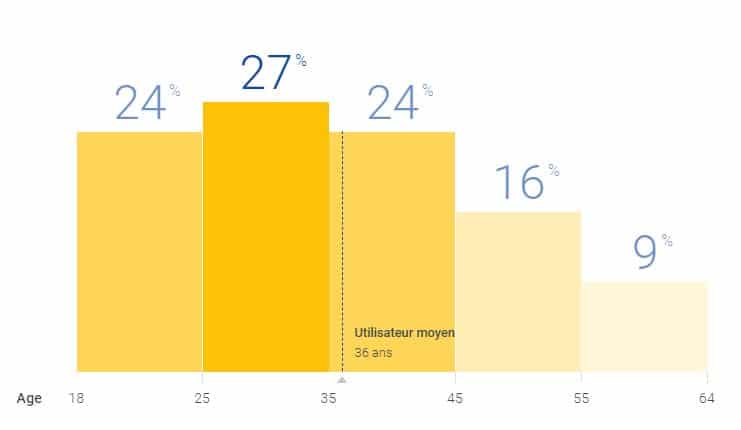Ce sont les 25-34 ans qui utilisent le plus les applications d’entertainment (27%) et la moyenne d’âge des utilisateurs est de 36 ans. Les 45-54 ans et les 55-64 ans sont ceux qui utilisent le moins ce genre d’applications (respectivement 16% et 9%).