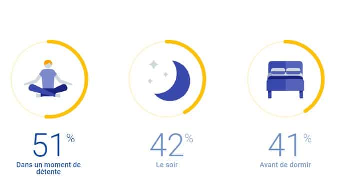Comme pour les applications de gaming, les applications d’entertainment sont le plus souvent utilisées pendant un moment de détente (51%). Par ailleurs, elles sont également le plus souvent utilisées le soir (42%) ou avant de dormir (41%).