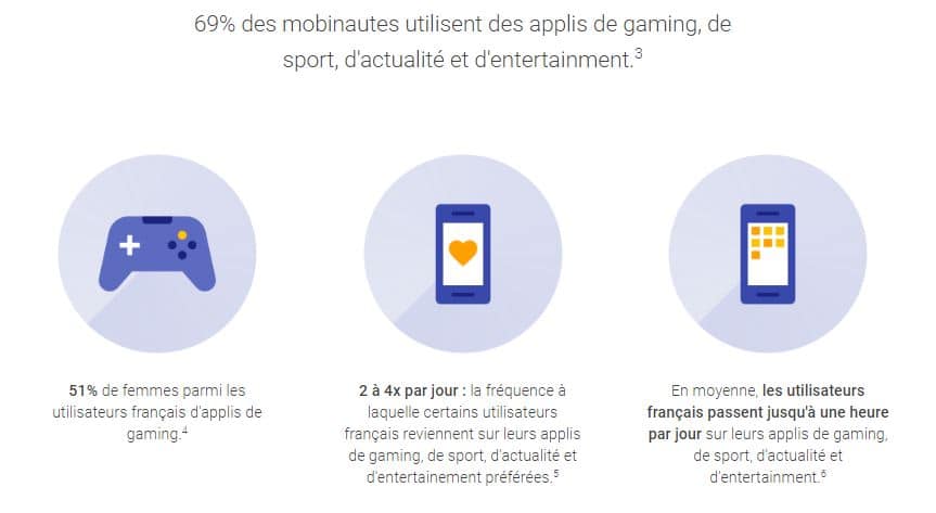 69% des mobinautes utilisent des applications de gaming, de sport, d’actualité et d’entertainment. Ces derniers reviennent entre 2 et 4 fois par jour sur ces applications afin de consommer du contenu et passent en moyenne une heure par jour sur celles-ci.