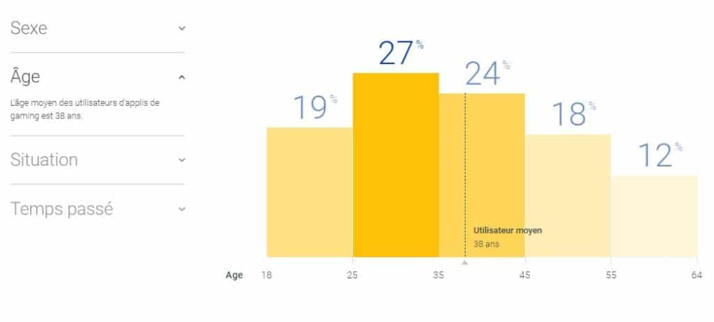 Les utilisateurs d’applications de gaming ont une moyenne d’âge de 38 ans. Ce sont les 25-34 ans qui utilisent le plus ce genre d’applications au quotidien (27%). Au contraire, ce sont les 55-64 ans qui utilisent le moins les applications de gaming (12%).