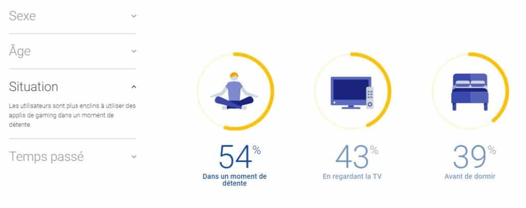 Les applications de gaming sont le plus souvent utilisées dans un moment de détente (54%). Elles sont également souvent utilisées en regardant la TV (43%) ou avant de dormir (39%).