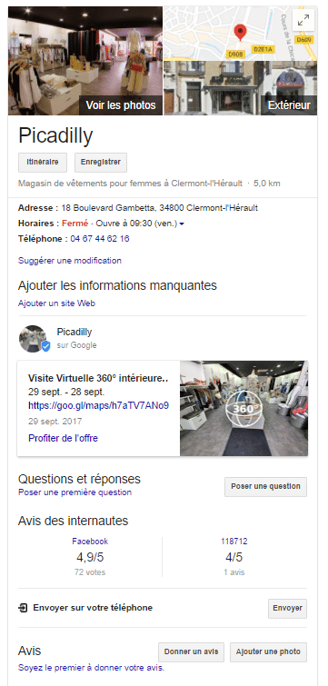 Google My Business est au cœur des usages des individus. A vous de créer votre fiche et de faire en sorte de la maintenir à jour. Cela vous permettra également d’apparaître dans Google Maps. A noter que vous pouvez inciter vos clients / visiteurs en magasin à laisser un commentaire en ligne, cela vous permettra de gagner en positionnement. En effet, les commentaires sont pris en compte dans le référencement des fiches Google My Business dans les résultats de recherche.