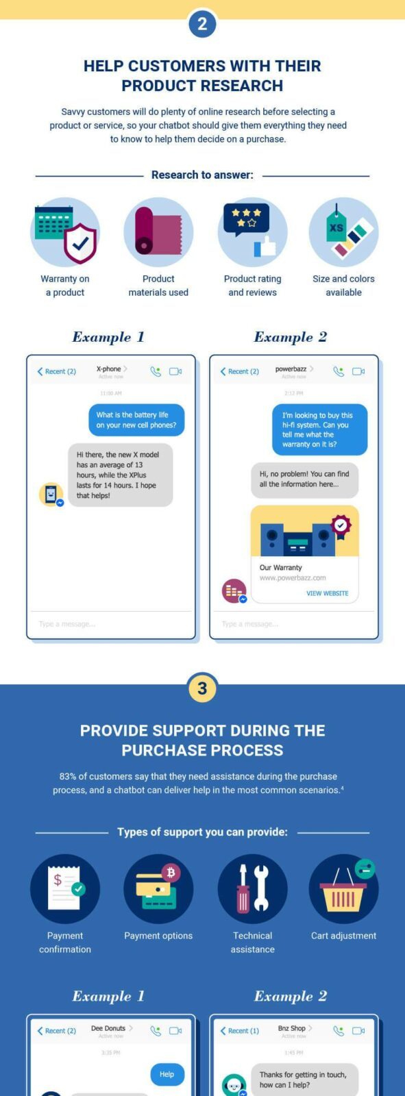 Grâce à un chatbot, vous pouvez proposer un support client tout au long du processus d’achat. Ainsi, vous pouvez confirmer le paiement, indiquer les options de paiement disponibles, proposer une assistance technique, etc.