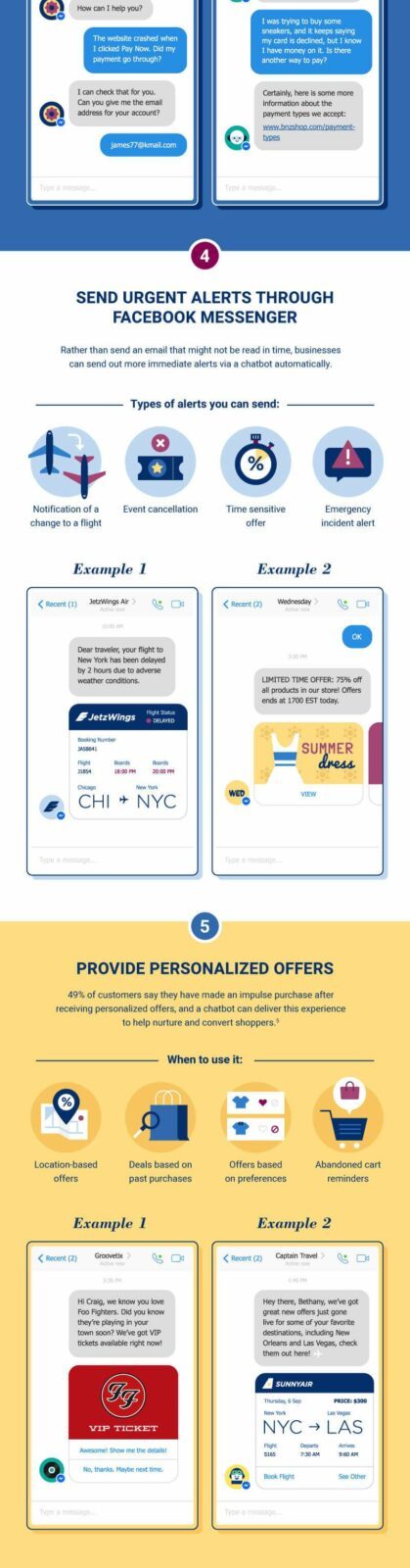 Plutôt que d’envoyer un email qui pourrait ne pas être lu dans les temps, vous pouvez envoyer (à petite dose) des alertes via votre chatbot sur la messagerie Facebook. Ainsi, vous pouvez indiquer à vos clients si vos horaires ont changé, si votre événement a été annulé, si vous proposez une offre limitée dans le temps, etc.