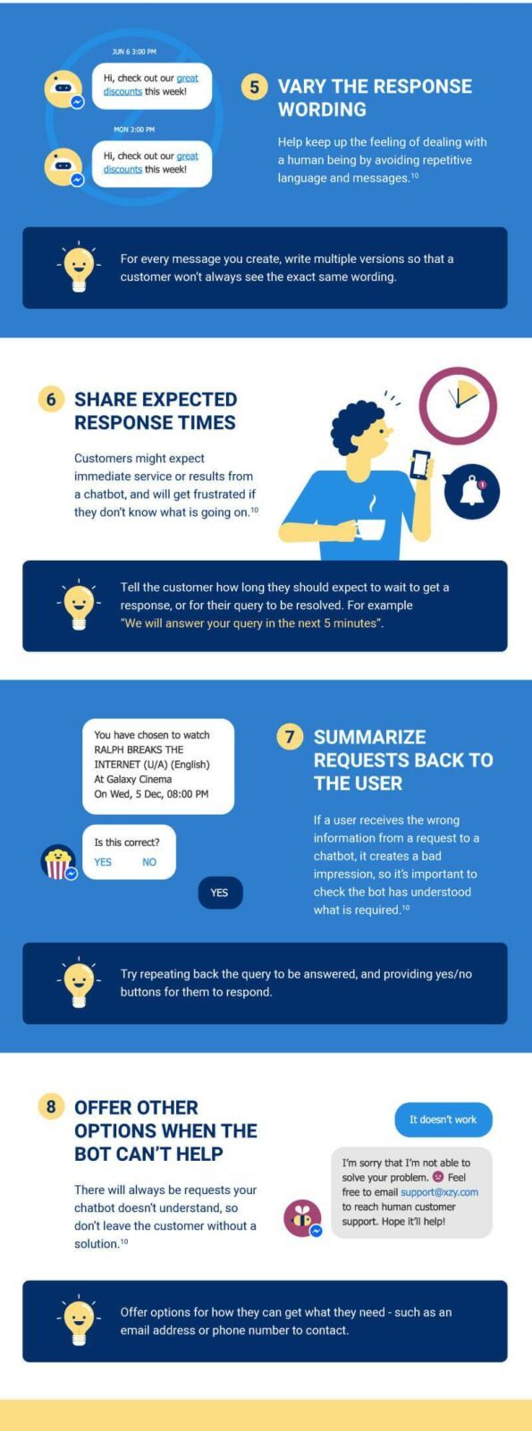- Proposez des solutions de secours (numéros de téléphone, email, etc) si le chatbot n’a pas réussi à répondre à la demande spécifique de l’internaute.