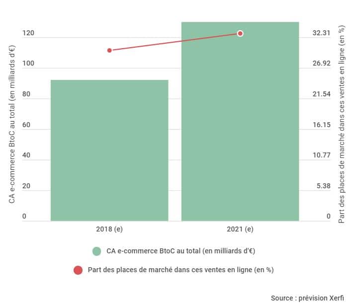 Les marketplaces représentent une part de plus en plus importante de l’e-commerce français comme vous pouvez le voir dans le graphique ci-dessous réalisé par Xerfi. Un tiers des ventes e-commerce en France seront issues de ce canal de vente d’ici trois ans, toujours selon Xerfi.