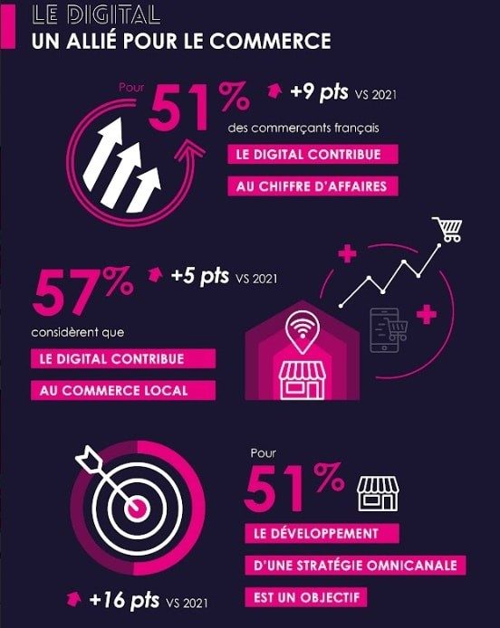 Ce constat suit une logique établie, 51 % des commerçants français considérant que le digital contribue à leur chiffre d’affaires, soit une augmentation de 9 points de plus par rapport au dernier baromètre de juin 2021.