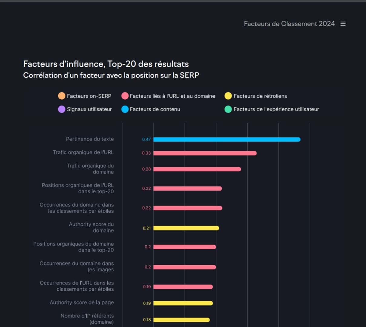 Parmi les nombreux facteurs pris en compte, ceux qui ont le plus d’impact sur le classement dans les pages de résultats des moteurs de recherche (SERP) sont la pertinence du contenu textuel et le volume de trafic organique vers l’URL et le domaine.