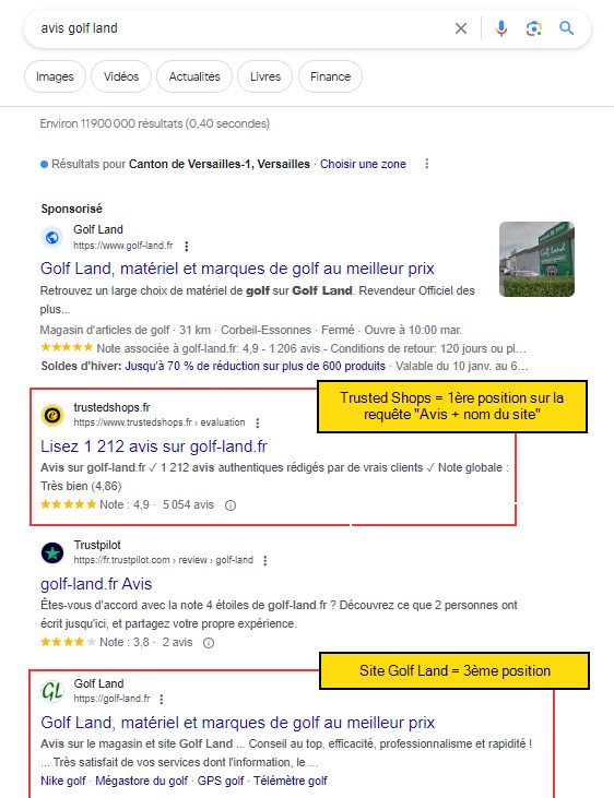 Chez Trusted Shops, nous privilégions toujours les avis service car ils constituent la première vitrine d’un site e-commerce. Lors des recherches sur Google, ils apparaissent sur les rich snippets et améliorent la visibilité de l’URL du site. Ces avis renforcent la fiabilité et la crédibilité du marchand, et attirent davantage de trafic vers le site.