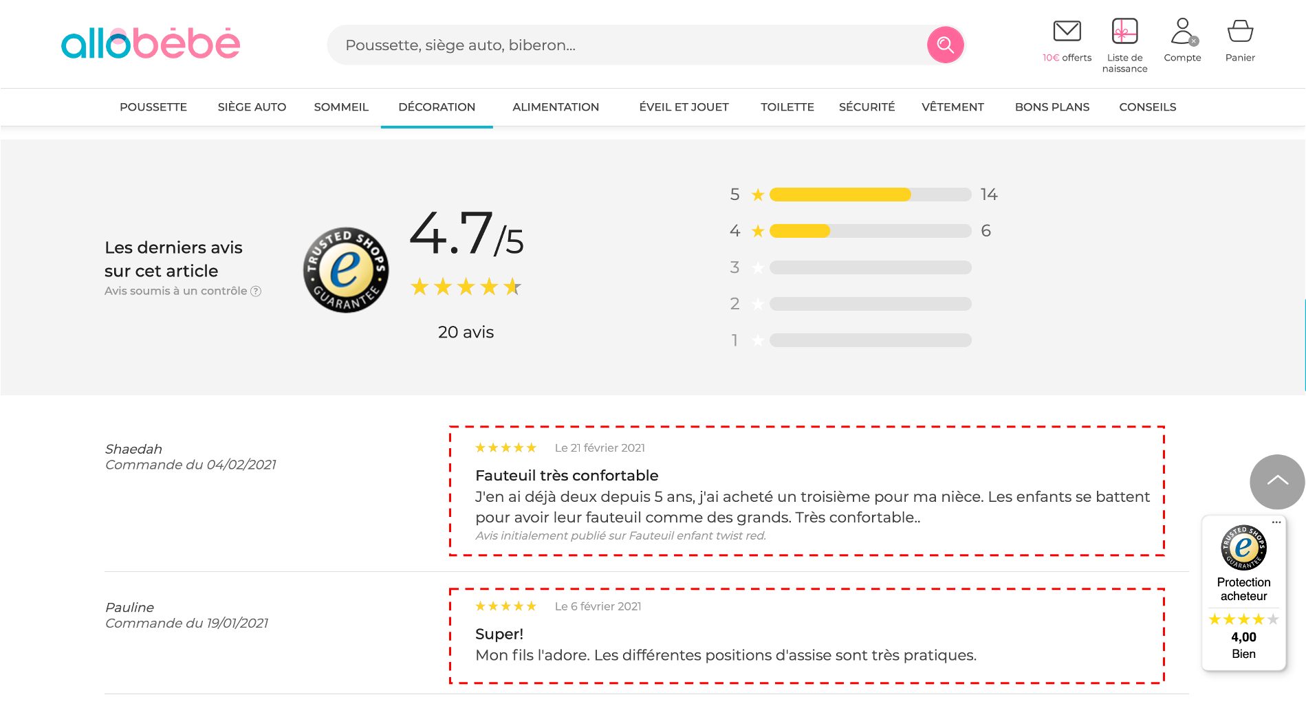 Un marchand qui affiche des avis service et des avis produits est favorisé : l’ensemble du parcours d’achat est ainsi couvert avec des avis tout au long du parcours. La réassurance est ainsi au maximum.