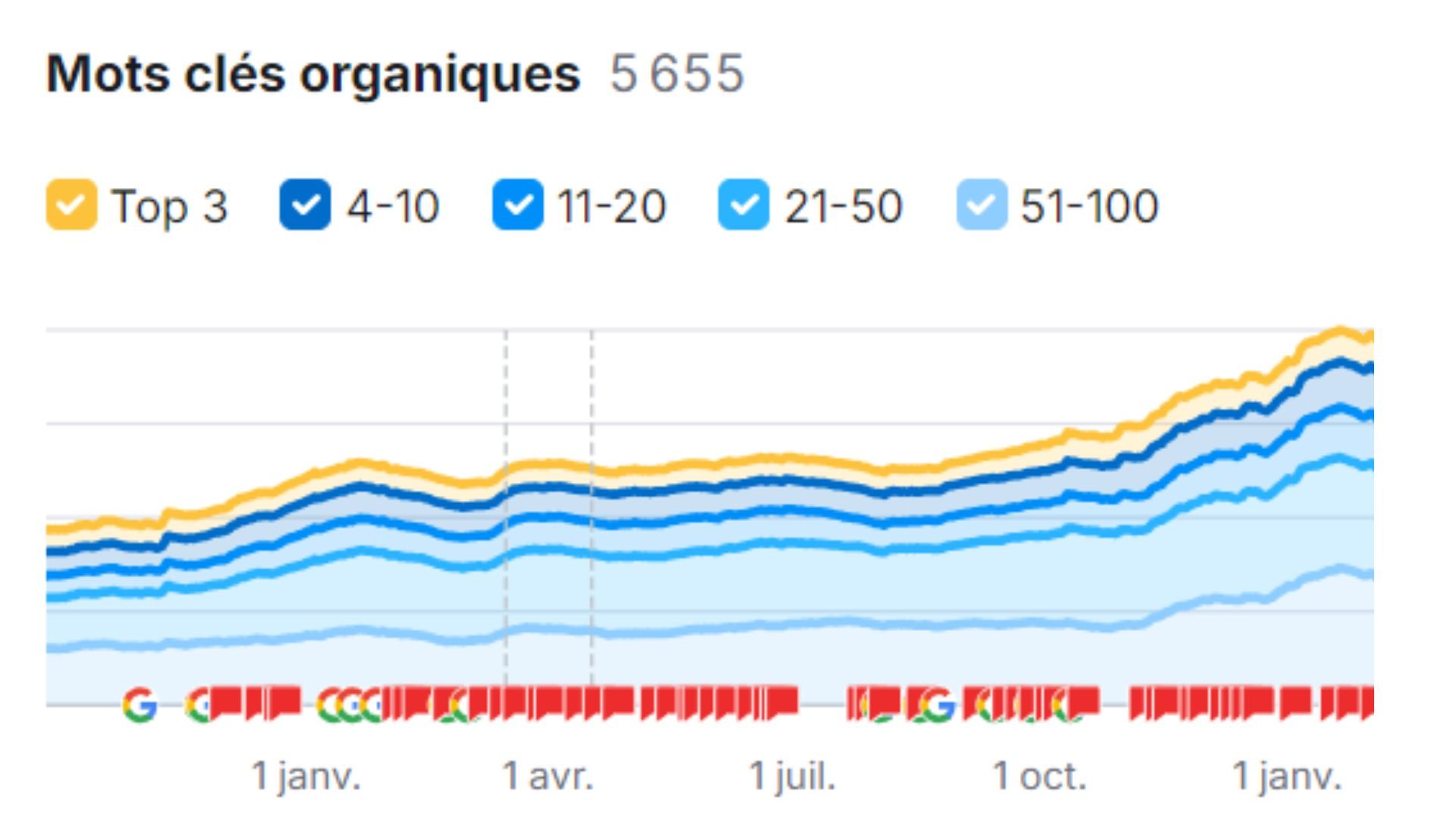 Notre stratégie de netlinking a permis de renforcer l’autorité des sites de Blouse Medicale. Le Domain Rank a connu une augmentation significative grâce à la création de backlinks de qualité. Cette amélioration de l’autorité du site a contribué à renforcer la position du site dans les résultats des moteurs de recherche, augmentant ainsi sa visibilité.